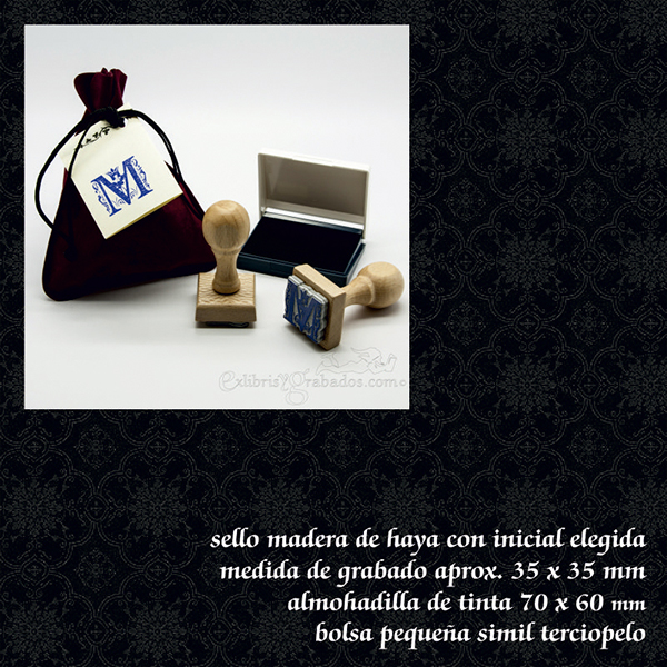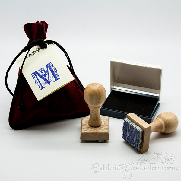 Sello con inicial de madera de haya + Bolsa limosnera + Tinta